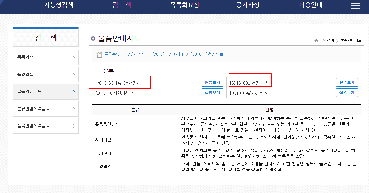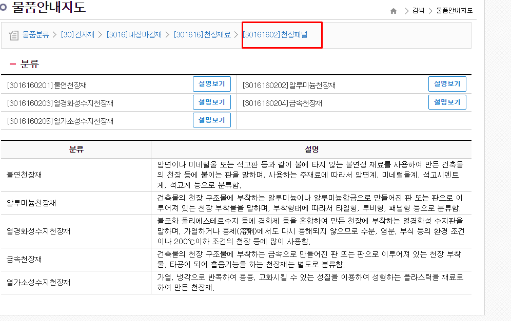조달청 나라장터에 등록되어 있는 천장재료의 물품안내지도 확인하기