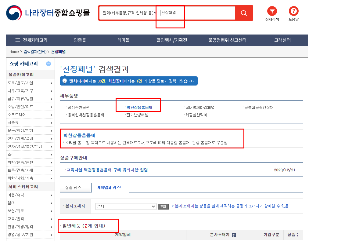 나라장터 종합쇼핑몰 천장패널 확인하기