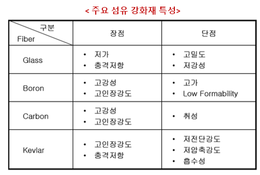 복합재료에 사용하는 섬유 강화재로는 유리섬유,탄소섬유, Boron, 아라미드 등 다양한 소재가 있음