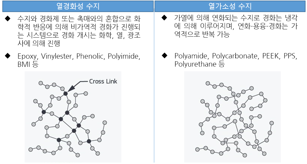 복합재료의 기지재로 사용하는 수지는 크게 열경화성 수지와 열가소성 수지로 구분하며, 수지의 선택은 ❶접착성, ❷역학특성과 ❸수분 침투에 따른 물성 저하를 고려