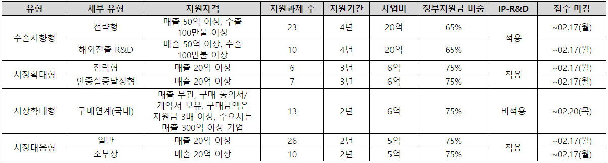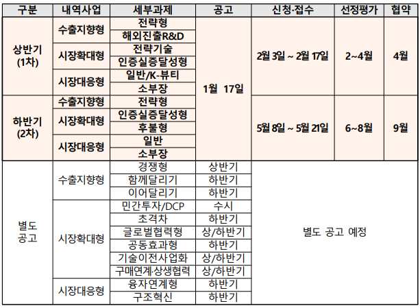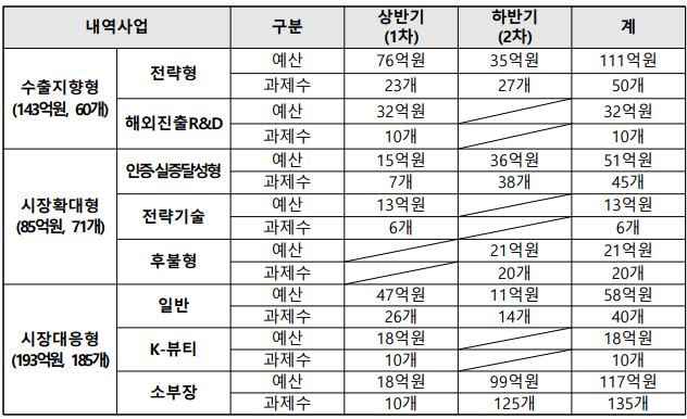 * 대상사업 : 수출지향형(전략형, 해외진출R&D), 시장확대형(전략기술, 인증·실증달성형), 시장대응형(일반, K-뷰티, 소부장)