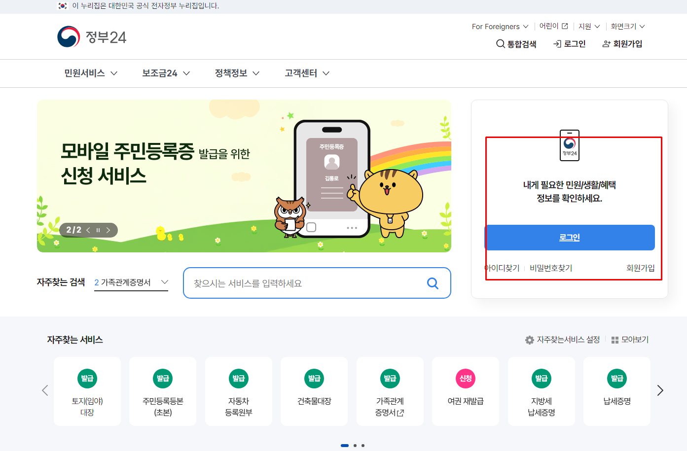 로그인은 공인인증서나 간편로그인 통해 진행하시면 됩니다.