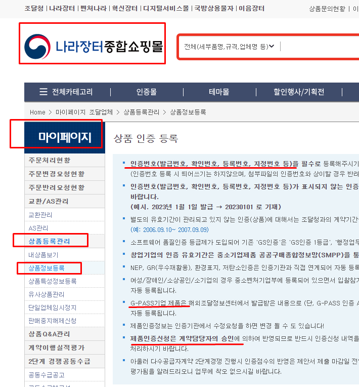 조달청 나라장터에 등록된 상품의 인증서 항목을 등록하는 방법