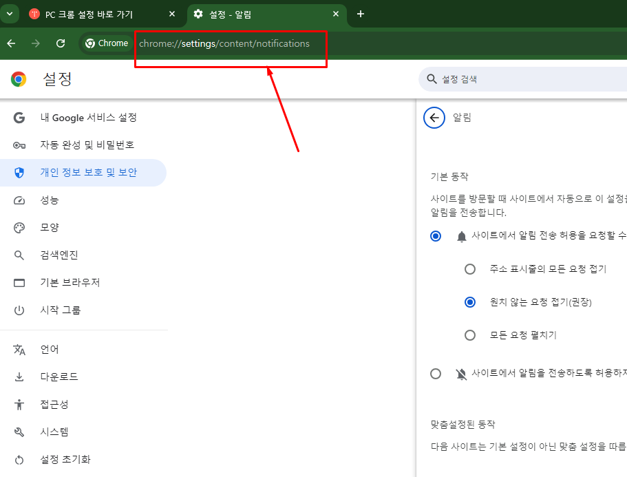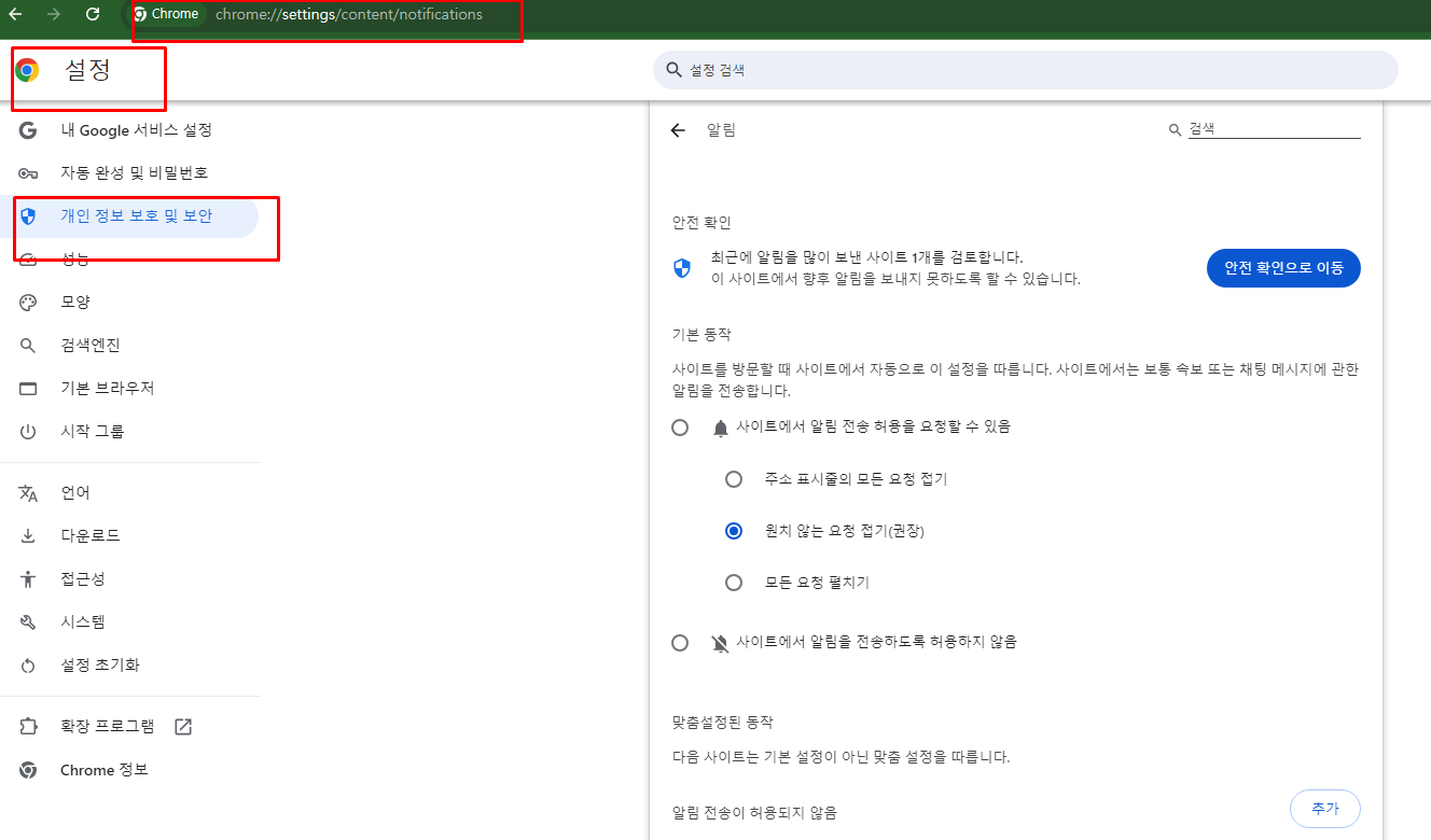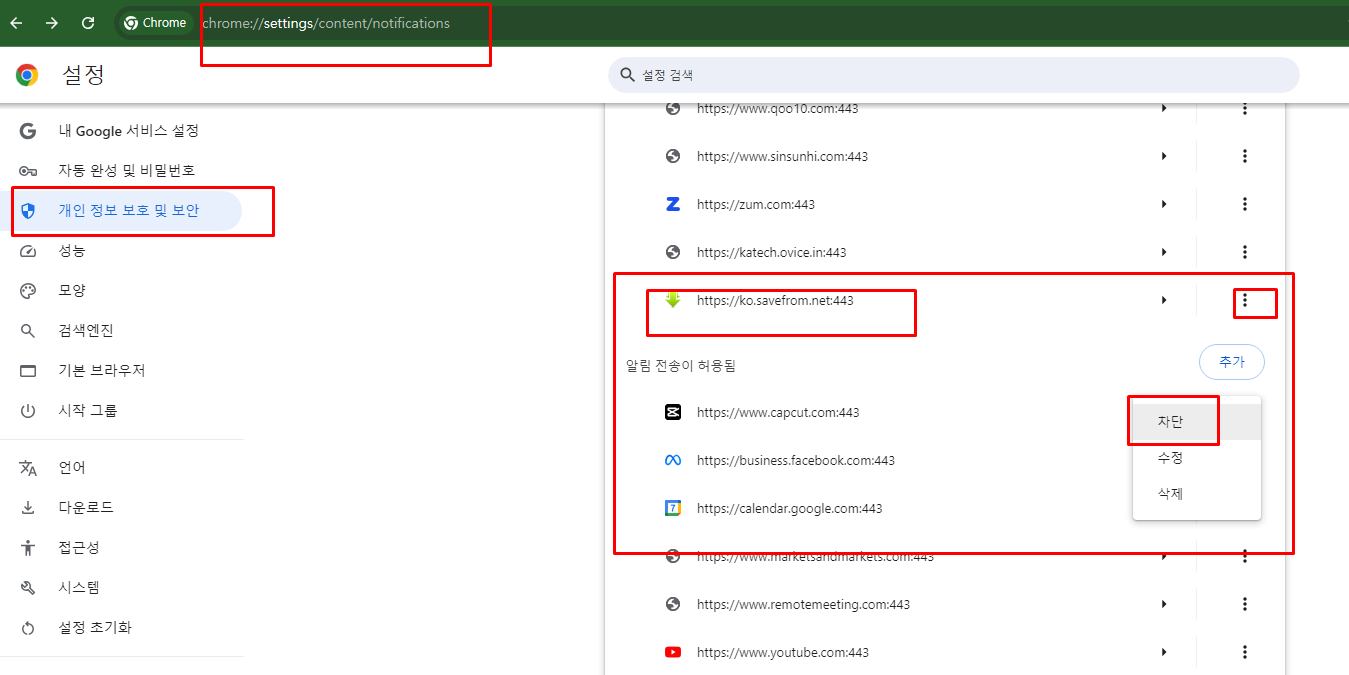 알림전송이 허용됨 리스트 확인 후 차단하기