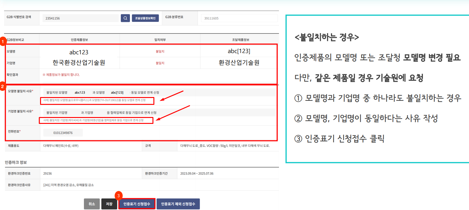 환경표지 등록 인증서 번호와 조달품목제품번호 시스템 연결은 수기 등록하여야 나라장터에 표시 됩니다.