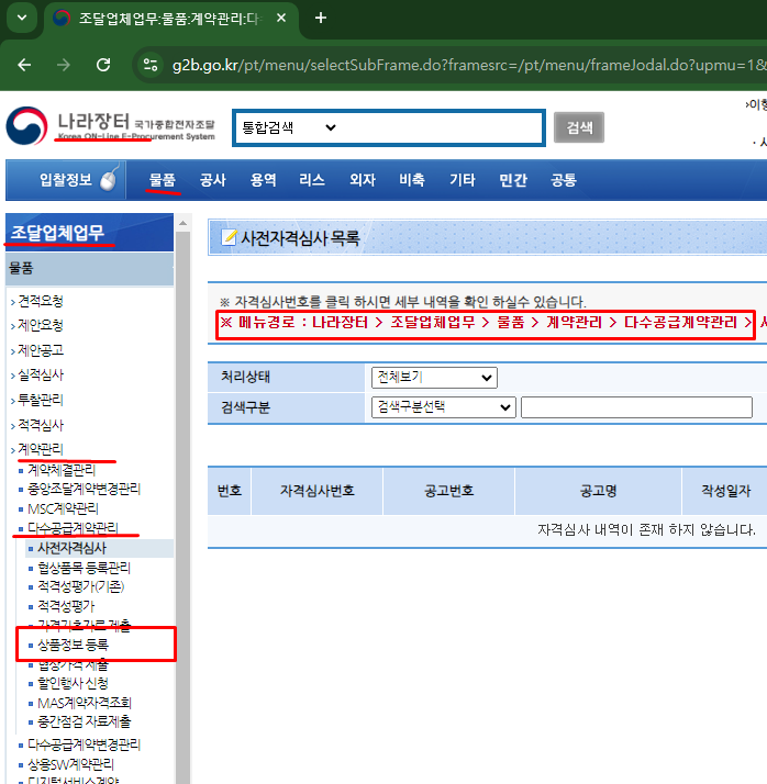 나라장터=>조달업체업무 => 물품 => 계약관리 => 다수공급계약관리=>상품정보등록